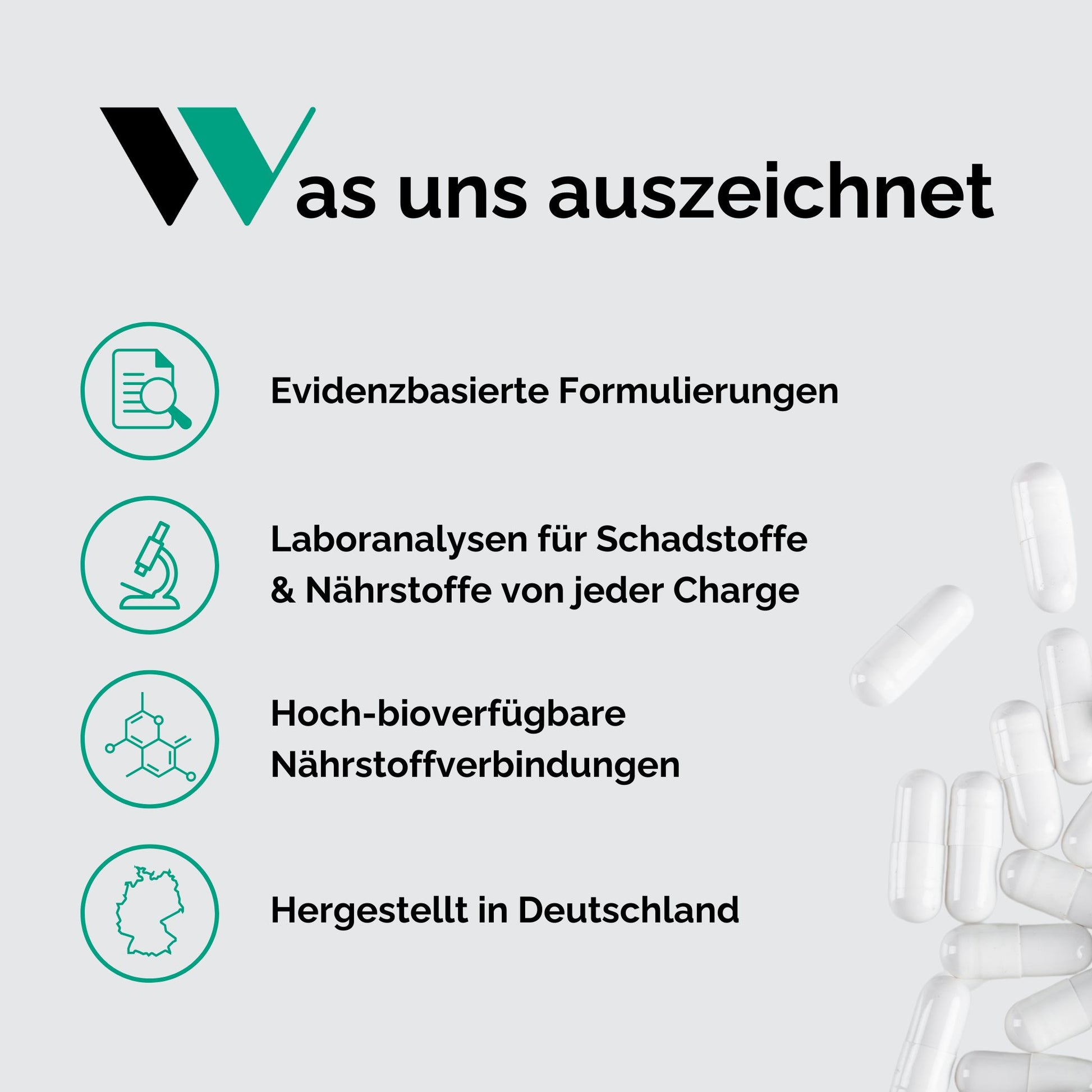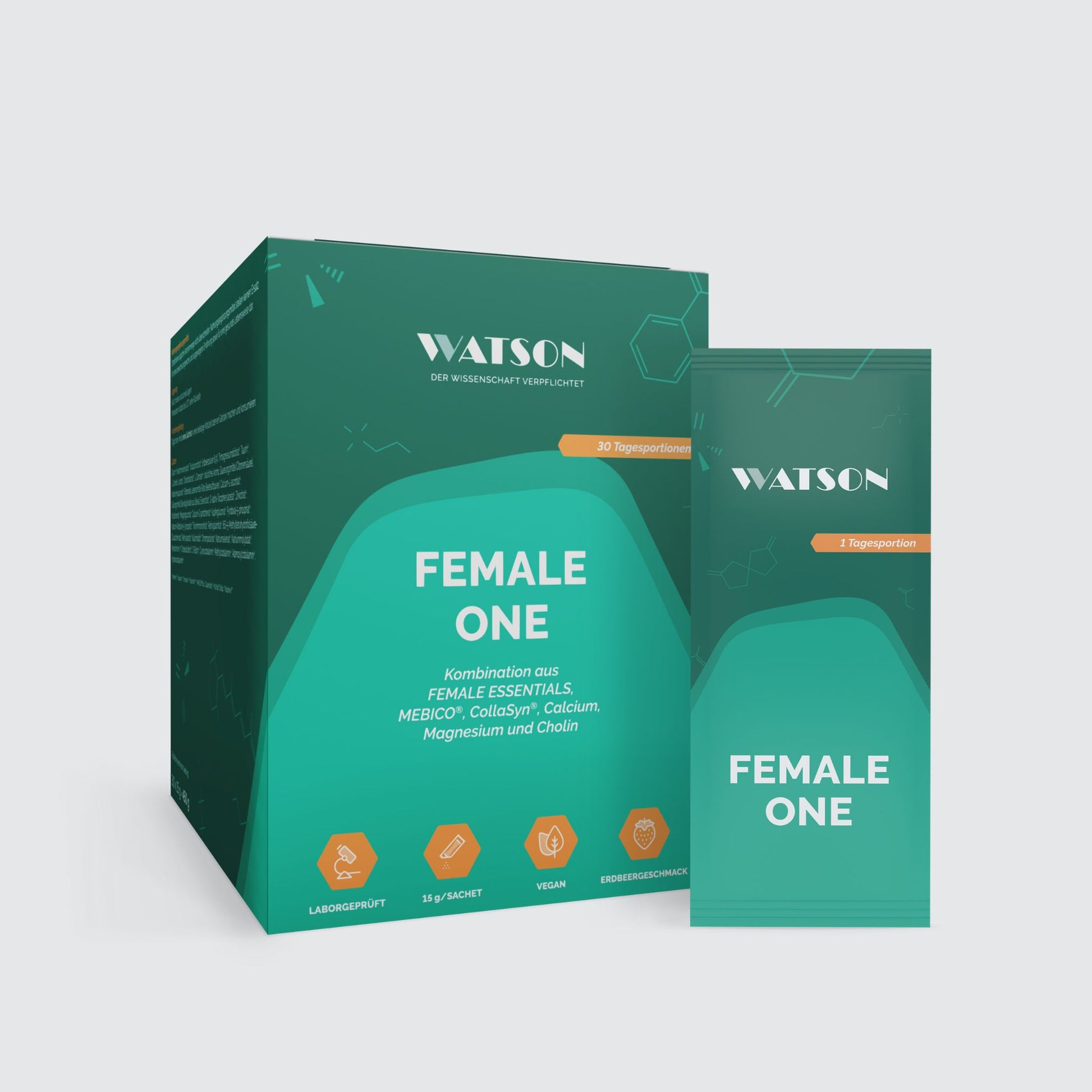 Dieser Multinährstoff stellt in Bezug auf die Nährstoffauswahl die Summe der folgenden Produkte dar: Female Essentials, Calcium, Magnesium, Cholin, MEBICO® und CollaSyn®